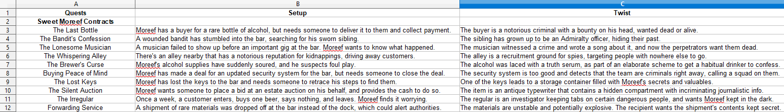 Understanding all of those factors in play, I had a decision to make: Err on the side of caution and toss away the spreadsheet in order to start from scratch all over again, or err on the side of reckless expedience and keep the spreadsheet so I can get straight to work on filling out content for the mod.